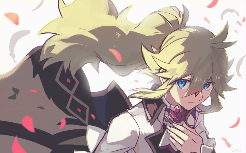 1boy ascot blue_eyes commentary floating_hair flower frills green_hair hair_between_eyes hand_up long_hair long_sleeves looking_at_viewer male_focus n_(anniversary_2021)_(pokemon) n_(pokemon) nintendo official_alternate_costume petals pokemon pokemon_masters_ex ponytail sidelocks solo untranslatable_commentary tpi_ri two-tone_neckwear upper_body waist_cape white_neckwear