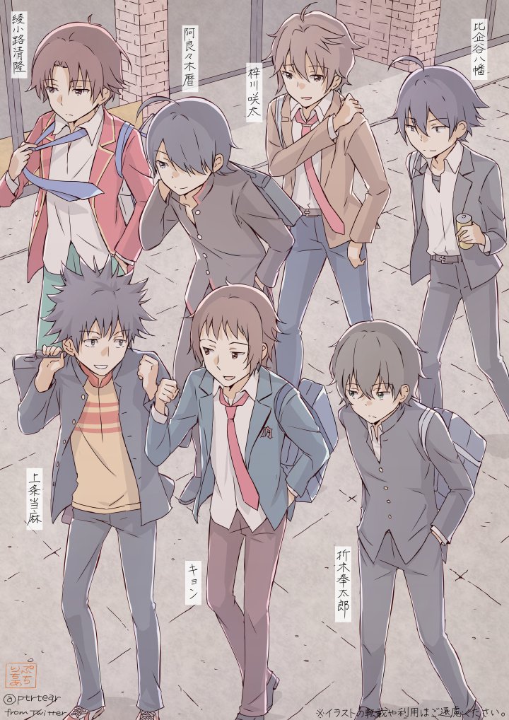 6+boys advanced_nurturing_high_school_uniform ahoge araragi_koyomi artist_name ayanokouji_kiyotaka azusagawa_sakuta bag black_eyes black_hair black_jacket black_pants blazer blue_neckwear blue_pants brown_eyes brown_footwear brown_hair brown_jacket brown_pants can character_name closed_mouth collared_shirt commentary_request crossover drink gakuran green_pants hand_in_pocket hands_in_pockets hikigaya_hachiman holding holding_bag holding_can holding_drink hyouka jacket kamijou_touma kita_high_school_uniform kyon male_focus monogatari_(series) multiple_boys multiple_crossover naoetsu_high_school_uniform necktie open_clothes open_collar open_jacket open_mouth orange_shirt oreki_houtarou outdoors pants ptrtear red_jacket red_neckwear school_uniform seishun_buta_yarou shirt shirt_tucked_in shoes short_hair sneakers sobu_high_school_uniform spiked_hair suzumiya_haruhi_no_yuuutsu swept_bangs talking toaru_majutsu_no_index translation_request twitter_username untucked_shirt walking watermark white_shirt yahari_ore_no_seishun_lovecome_wa_machigatteiru. youkoso_jitsuryoku_shijou_shugi_no_kyoushitsu_e