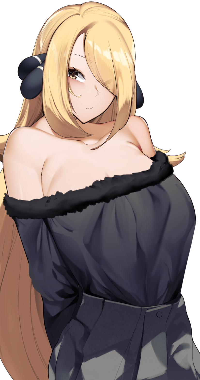 1girl arms_behind_back bare_shoulders black_shirt blonde_hair breasts cynthia_(pokemon) hair_ornament hair_over_one_eye highres long_hair looking_at_viewer nintendo off-shoulder_shirt off_shoulder pokemon pokemon_diamond/pearl/platinum shirt simple_background solo very_long_hair white_background yellow_eyes yuuyuu_(yuuki1771)