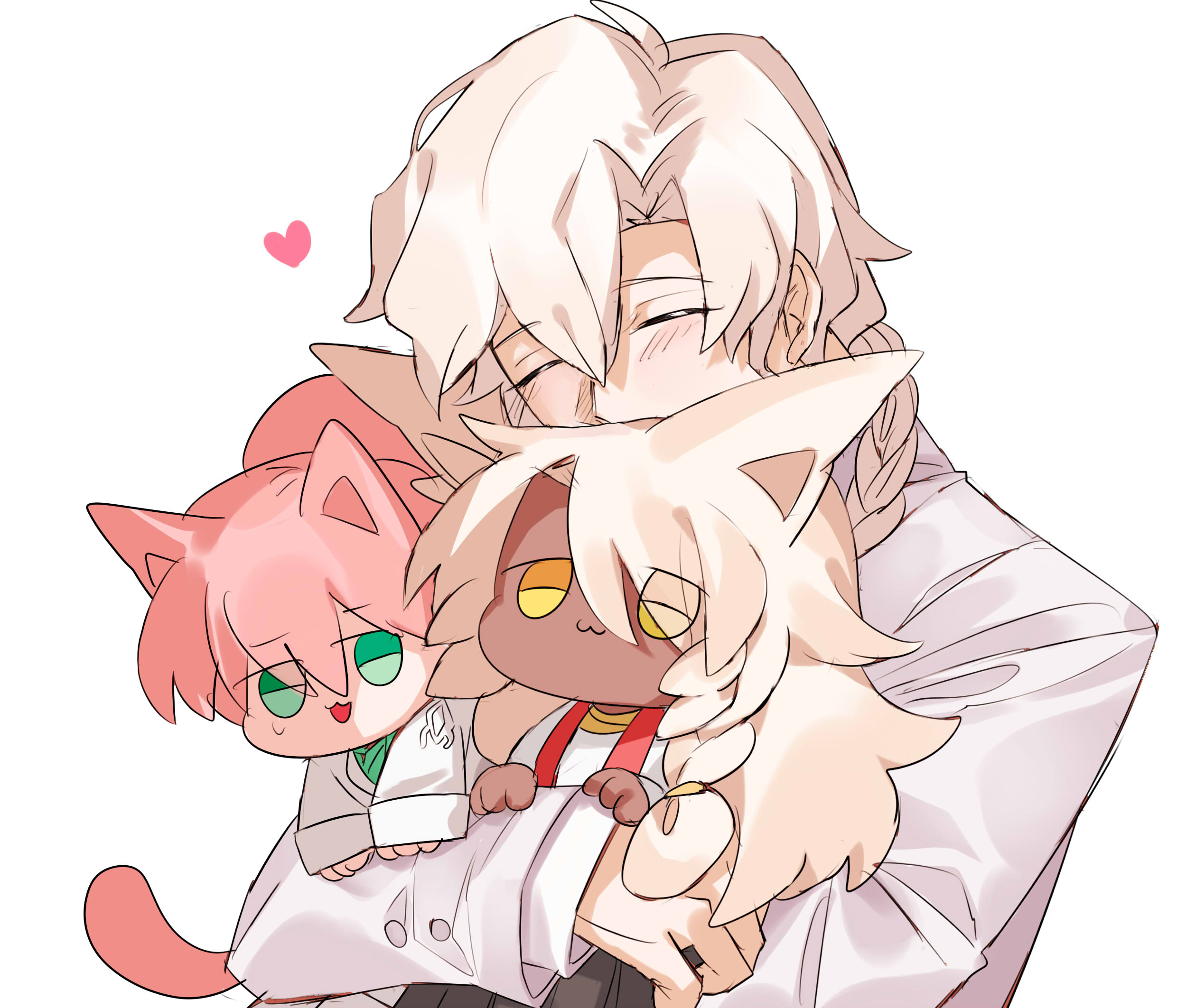 3boys :3 animal_ears braid cat_ears cat_tail chibi dark-skinned_male dark_skin closed_eyes fate/grand_order fate_(series) green_eyes hair_over_one_eye hair_over_shoulder han12sara heart highres hug long_sleeves male_focus marisbury_animusphere multiple_boys ponytail romani_archaman simple_background single_braid solo_focus solomon_(fate) sweat tail upper_body white_background white_hair yellow_eyes