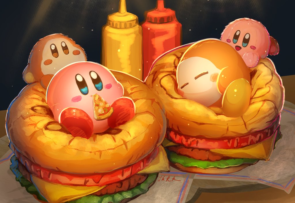 blue_eyes blush_stickers burger eating food ketchup ketchup_bottle kirby kirby_(series) mustard mustard_bottle nintendo pizza sakatani_yen sleeping stuffed_toy waddle_dee