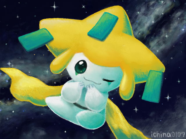 artist_name closed_mouth commentary_request gen_3_pokemon green_eyes hands_up ichina0107 jirachi legendary_pokemon looking_at_viewer mythical_pokemon nintendo no_humans one_eye_closed pokemon pokemon_(creature) smile solo space star_(sky)