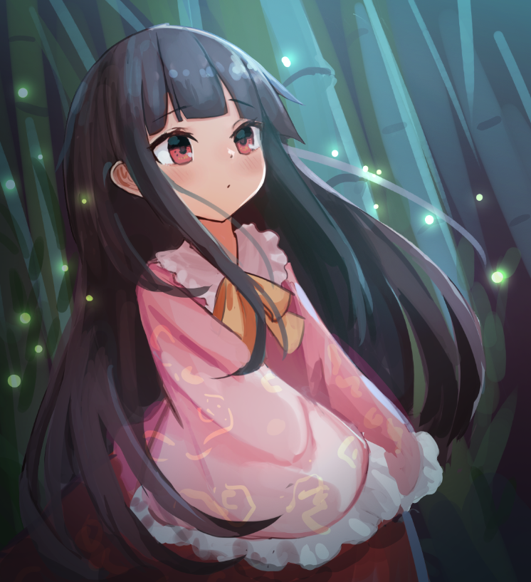 1girl :o bamboo black_hair blunt_bangs blush bow bowtie collared_shirt hime_cut houraisan_kaguya japanese_clothes long_hair long_skirt long_sleeves pink_shirt red_eyes red_skirt shirt skirt solarisu touhou very_long_hair wide_sleeves yellow_neckwear