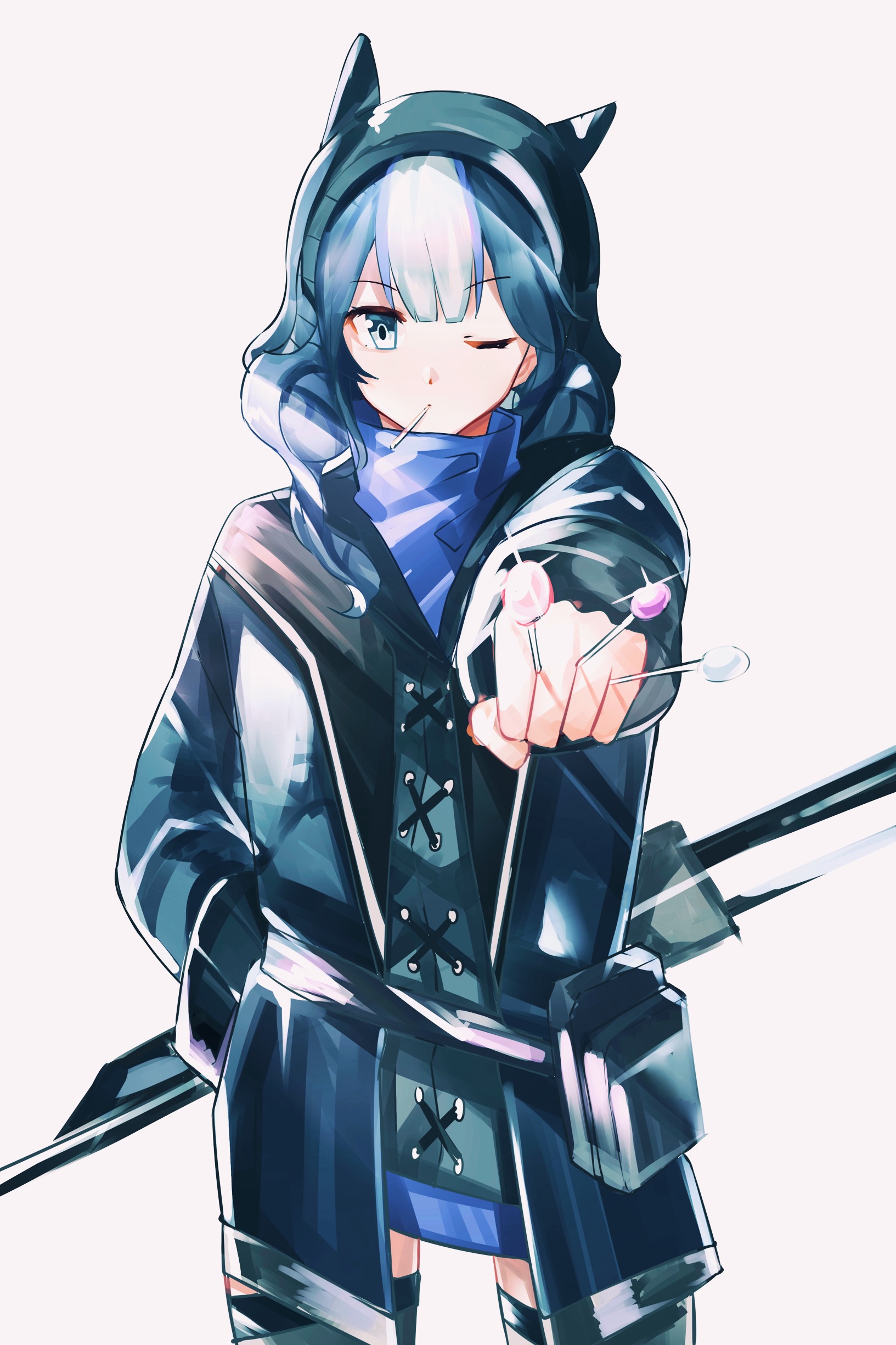 1girl absurdres arknights blue_eyes blue_hair blue_jacket candy closed_mouth double_bun dumenggu female_focus food food_in_mouth glaucus_(arknights) hair_bun hat highres jacket lollipop looking_at_viewer magnetic_weapon multicolored_hair one_eye_closed railgun simple_background solo streaked_hair thighhighs white_background