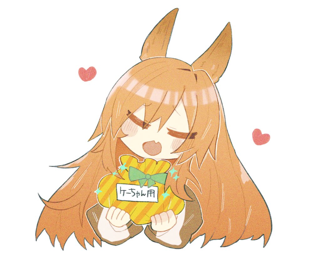 1girl animal_ears arknights blush bow brown_hair brown_jacket ceobe_(arknights) commentary cropped_legs dog_ears closed_eyes fang green_bow hands_up heart holding jacket long_hair niteenet open_mouth simple_background skin_fang solo translated upper_body white_background