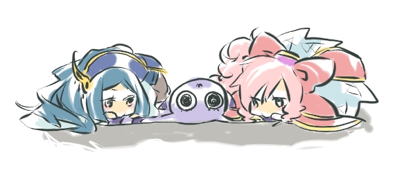 00s 2girls ar_tonelico ar_tonelico_ii blue_hair bow braid chibi gust hair_bow hair_ornament hat infel_(ar_tonelico) mimimi_(ar_tonelico) multiple_girls nenesha_(ar_tonelico) parted_bangs pink_hair side_braids simple_background stuffed_animal stuffed_rabbit stuffed_toy white_background yumemitsuki