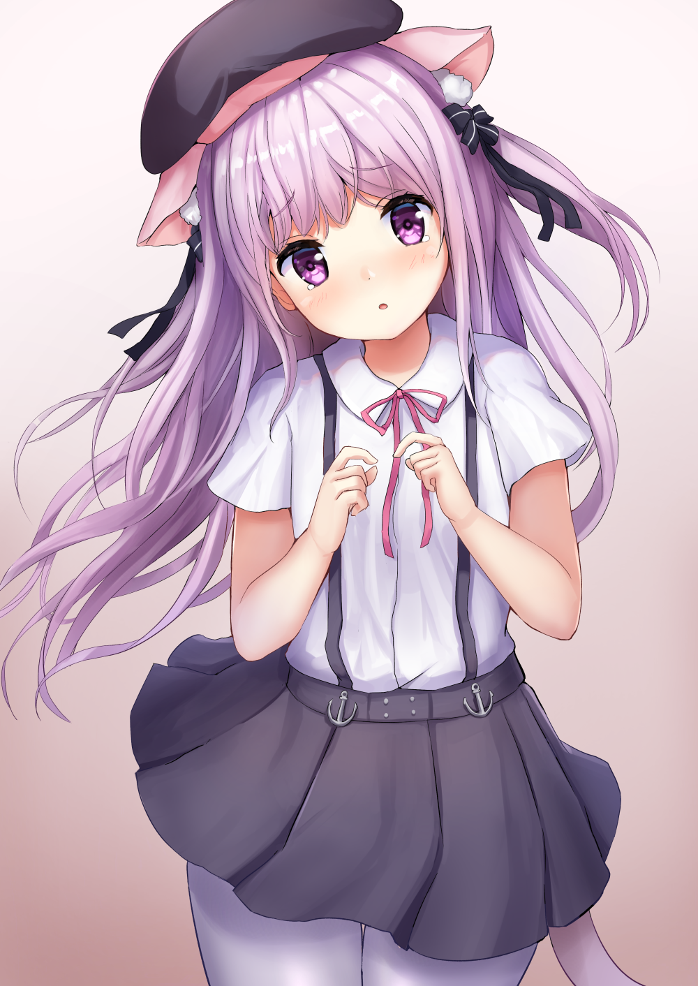 1girl animal_ears azur_lane black_skirt bow bowtie cat_ears cat_girl cat_tail collared_shirt commentary eyes_visible_through_hair hair_between_eyes hair_bow hair_ribbon hat head_tilt highres kisaragi_(azur_lane) kisaragi_(retrofit)_(azur_lane) light_purple_hair long_hair looking_at_viewer manda_(manda9n) pantyhose parted_lips pleated_skirt purple_eyes ribbon school_hat school_uniform shirt short_sleeves sidelocks skirt solo suspender_skirt suspenders tail thighhighs two_side_up white_shirt white_thighhighs zettai_ryouiki