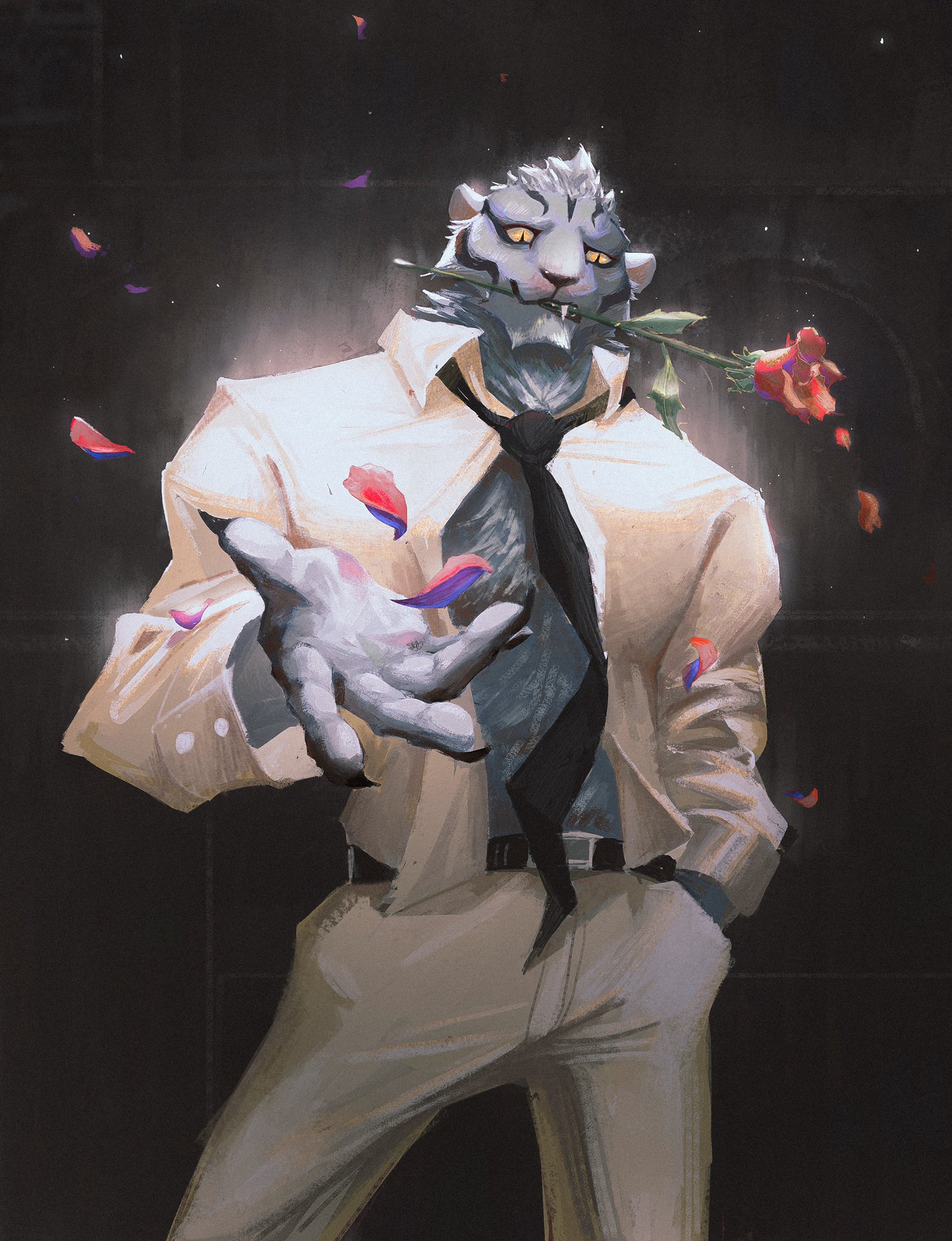 1boy belt black_belt black_necktie collared_shirt cowboy_shot flower fu_xiansheng_(the_legend_of_luoxiaohei) furry furry_male hand_in_pocket highres holding holding_flower long_sleeves male_focus mouth_hold necktie open_clothes open_shirt pants petals red_flower shirt solo luo_xiaohei_zhanji tiger_boy white_pants white_shirt yellow_eyes zzhenliu
