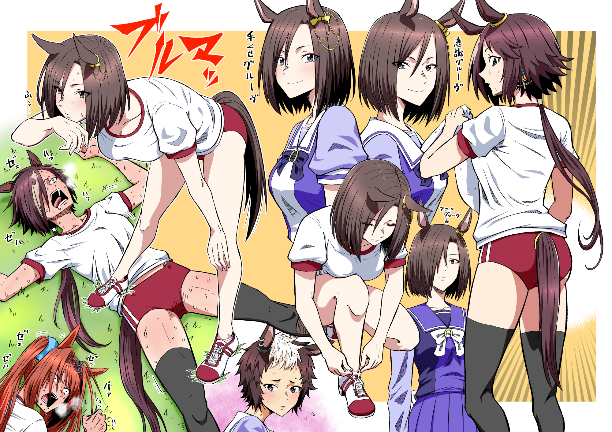 4girls air_groove_(umamusume) animal_ears birii blush bow bowtie brown_hair buruma daiwa_scarlet_(umamusume) earrings exhausted grey_eyes gym_uniform highres horse_ears horse_girl horse_tail horseshoe_ornament jewelry long_hair mejiro_ryan_(umamusume) multicolored_hair multiple_earrings multiple_girls multiple_views open_mouth orange_hair pleated_skirt ponytail puffy_short_sleeves puffy_sleeves purple_bow purple_bowtie purple_shirt sailor_collar sailor_shirt school_uniform serafuku shirt short_hair short_sleeves skirt smile summer_uniform tail thighhighs tracen_school_uniform translation_request twintails two-tone_hair tying_footwear umamusume vodka_(umamusume) white_hair