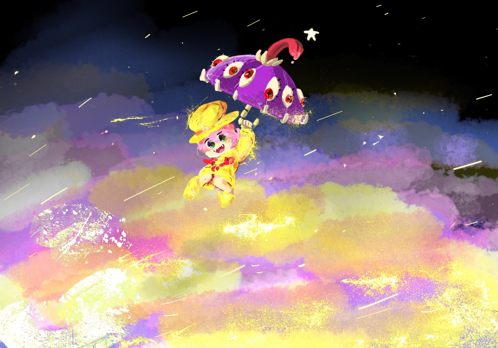 1girl abstract boots floating gerigimi18 hat hungern_(skullgirls) knees_up open_mouth psychedelic raincoat skullgirls smile solo umbrella umbrella_(skullgirls)