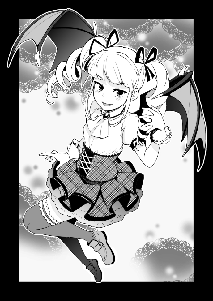 1girl :d aikatsu! aikatsu!_(series) ascot bat_wings black_border blunt_bangs blush border corset dress drill_hair fang fangs frills full_body greyscale grin hair_ribbon hand_up high-waist_skirt jumping long_hair looking_at_viewer mary_janes monochrome open_mouth parted_lips plaid_clothes plaid_skirt puffy_short_sleeves puffy_sleeves ribbon shirt shoes short_sleeves sidelocks skirt sleeveless smile solo tamagoroo thighhighs todo_yurika twin_drills twintails v-shaped_eyebrows wings wrist_cuffs wristband zettai_ryouiki