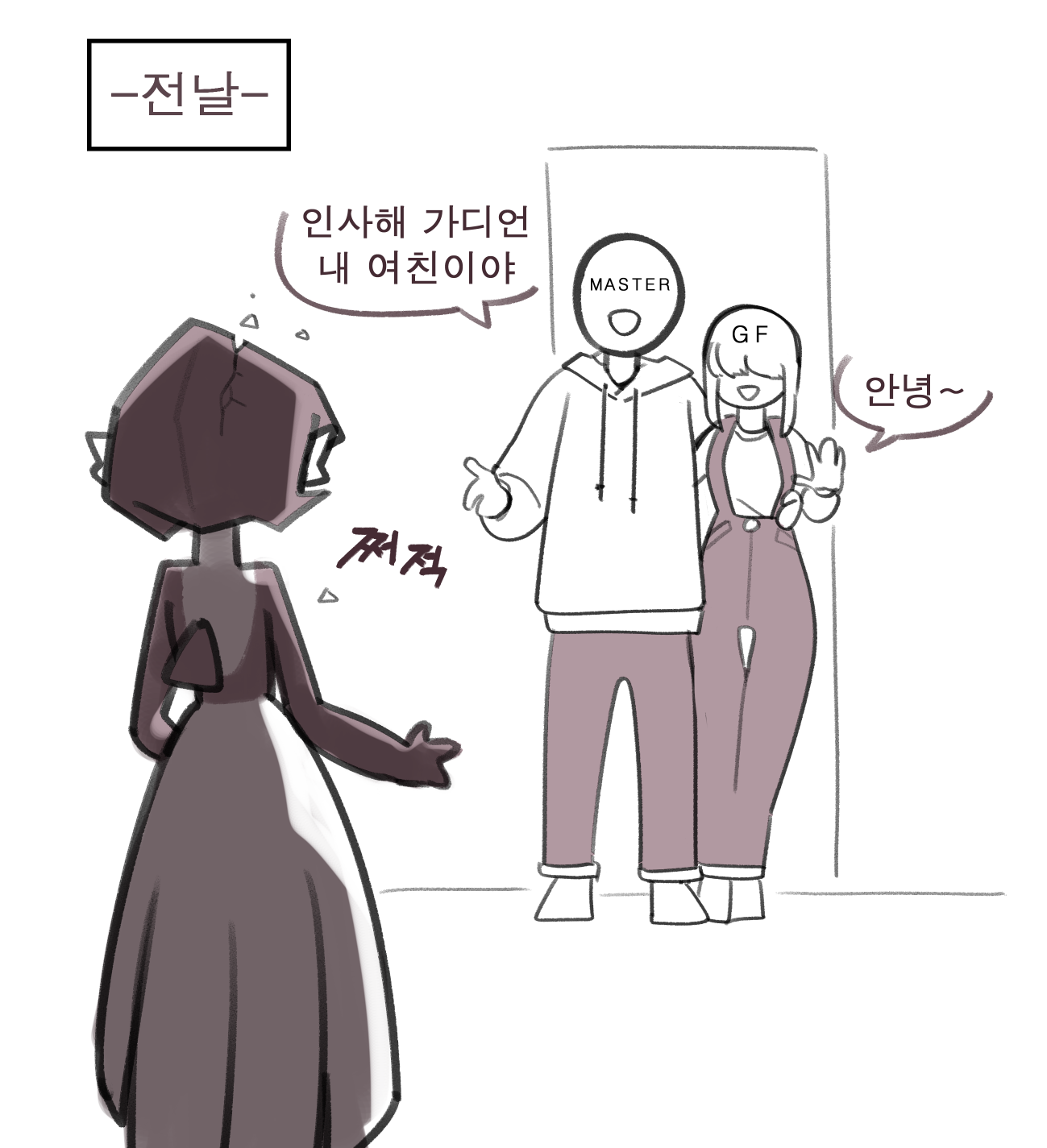 1boy 2girls arm_around_another's_waist colored_skin couple crack drawstring english_text faceless faceless_female faceless_male from_behind full_body gardevoir gen_3_pokemon gu_deulmok hair_over_eyes hand_up happy highres hood hoodie indoors korean_text long_sleeves monochrome multicolored_skin multiple_girls nintendo open_mouth original overalls pants pokemon pokemon_(creature) shirt short_hair sidelocks sketch smile speech_bubble standing sweater talking translated two-tone_skin waving