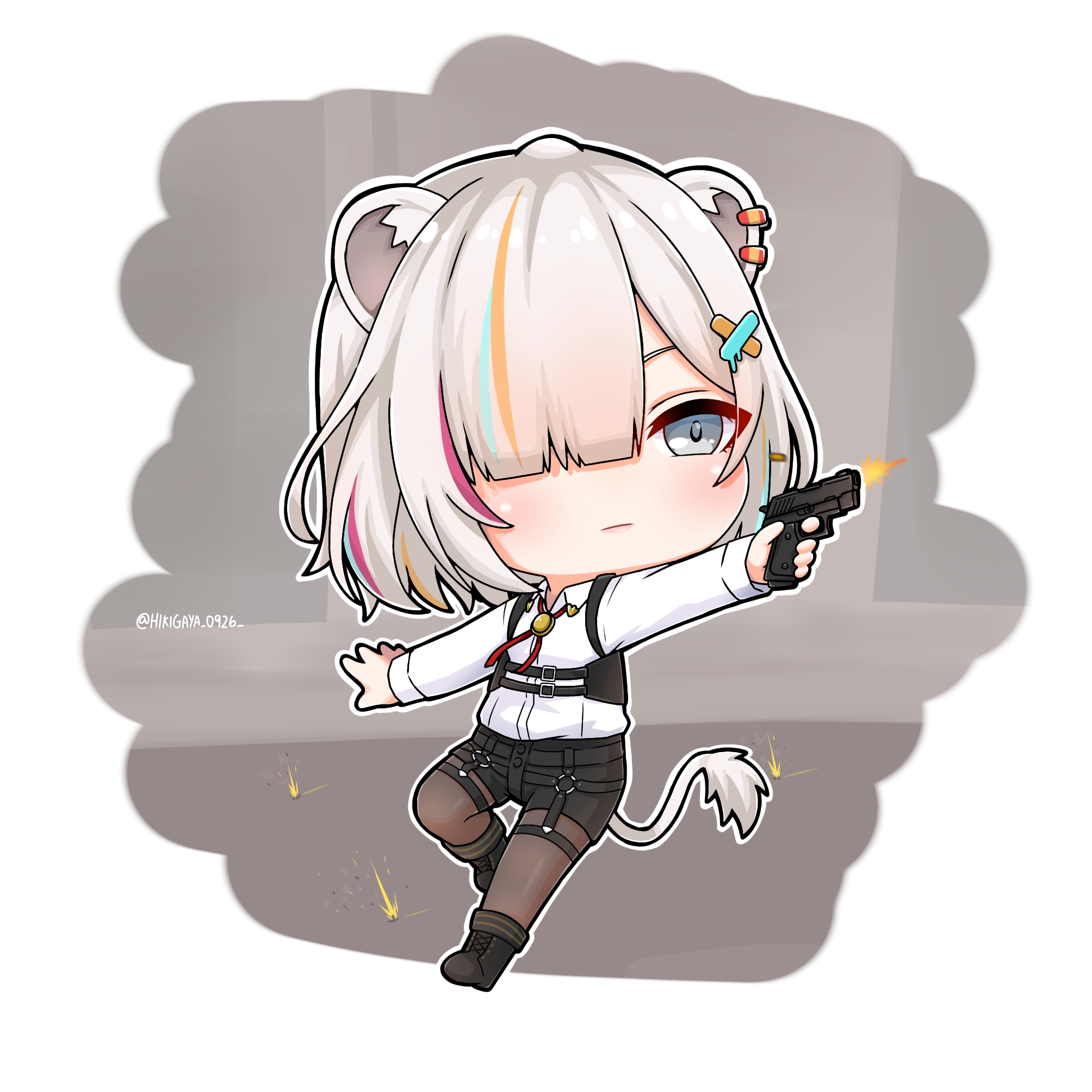 animal_ears asymmetrical_hair black_shorts chibi ear_piercing grey_eyes gun hair_over_one_eye handgun highres hikigaya_0926 hololive lion_ears lion_girl lion_tail pantyhose piercing pistol shishiro_botan shishiro_botan_(button-down) short_hair shorts solo tail virtual_youtuber weapon