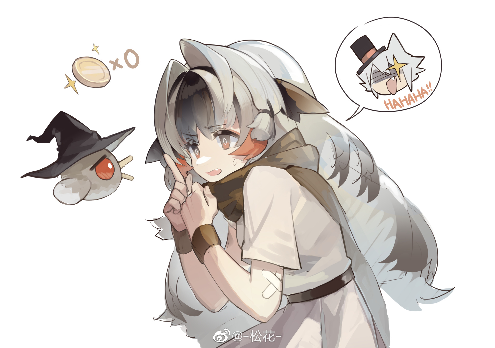 1girl arknights bandaid bandaid_on_arm belt bird black_belt black_hair black_scarf chinese_commentary click_(arknights) click_(grave_thief)_(arknights) coin commentary_request crossed_bandaids dress fang gradient_hair grey_hair hair_intakes hat highres long_hair looking_at_animal multicolored_hair official_alternate_costume open_mouth orange_hair scarf simple_background snowsant_(arknights) snowsant_(fated_hero)_(arknights) solo songhua spoken_character streaked_hair upper_body watermark weibo_watermark white_background white_dress witch_hat wristband