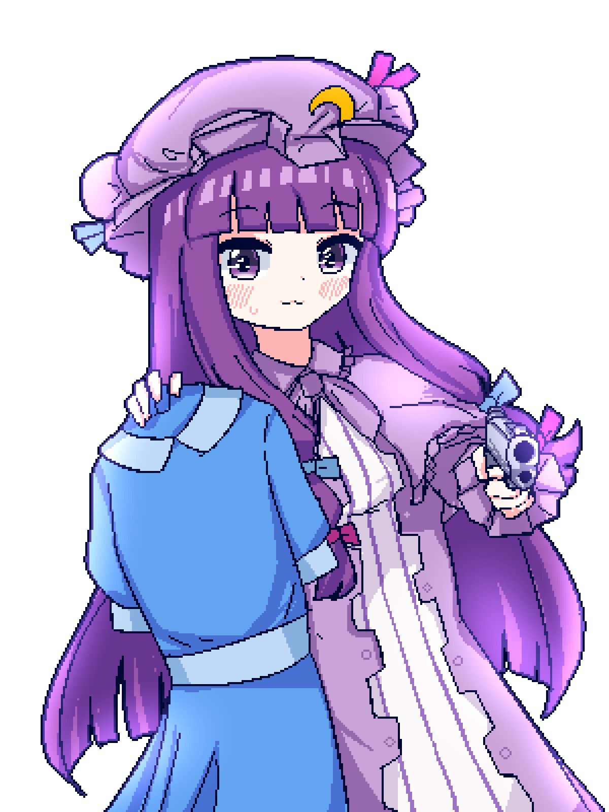 1girl :3 blue_dress chibikki collared_dress crescent crescent_hat_ornament dress gun hat hat_ornament highres holding holding_gun holding_unworn_clothes holding_unworn_dress holding_weapon long_dress mob_cap patchouli_knowledge pixel_art pointing pointing_at_viewer purple_eyes purple_hair purple_neckwear simple_background solo striped_clothes striped_dress touhou unworn_dress vertical-striped_clothes vertical-striped_dress weapon white_background