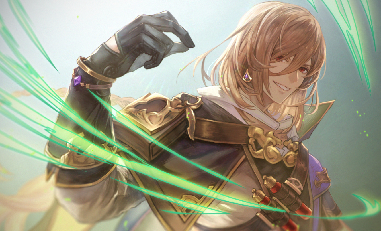 1boy blouse bracelet braid brown_hair ear_piercing gloves granblue_fantasy green_background jewelry lamorak_(granblue_fantasy) long_bangs long_hair numahidoi piercing red_eyes shirt smile snapping_fingers solo white_shirt wind