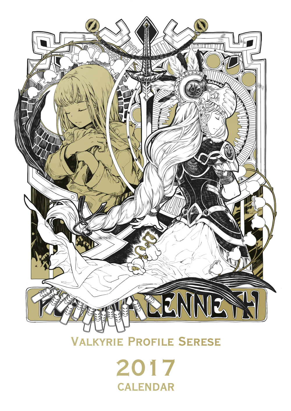 2girls armor braid dated helmet highres lenneth_valkyrie monochrome multiple_girls platina_(valkyrie_profile) shoulder_armor socha sword valkyrie valkyrie_profile_(series) valkyrie_profile_1 weapon winged_helmet