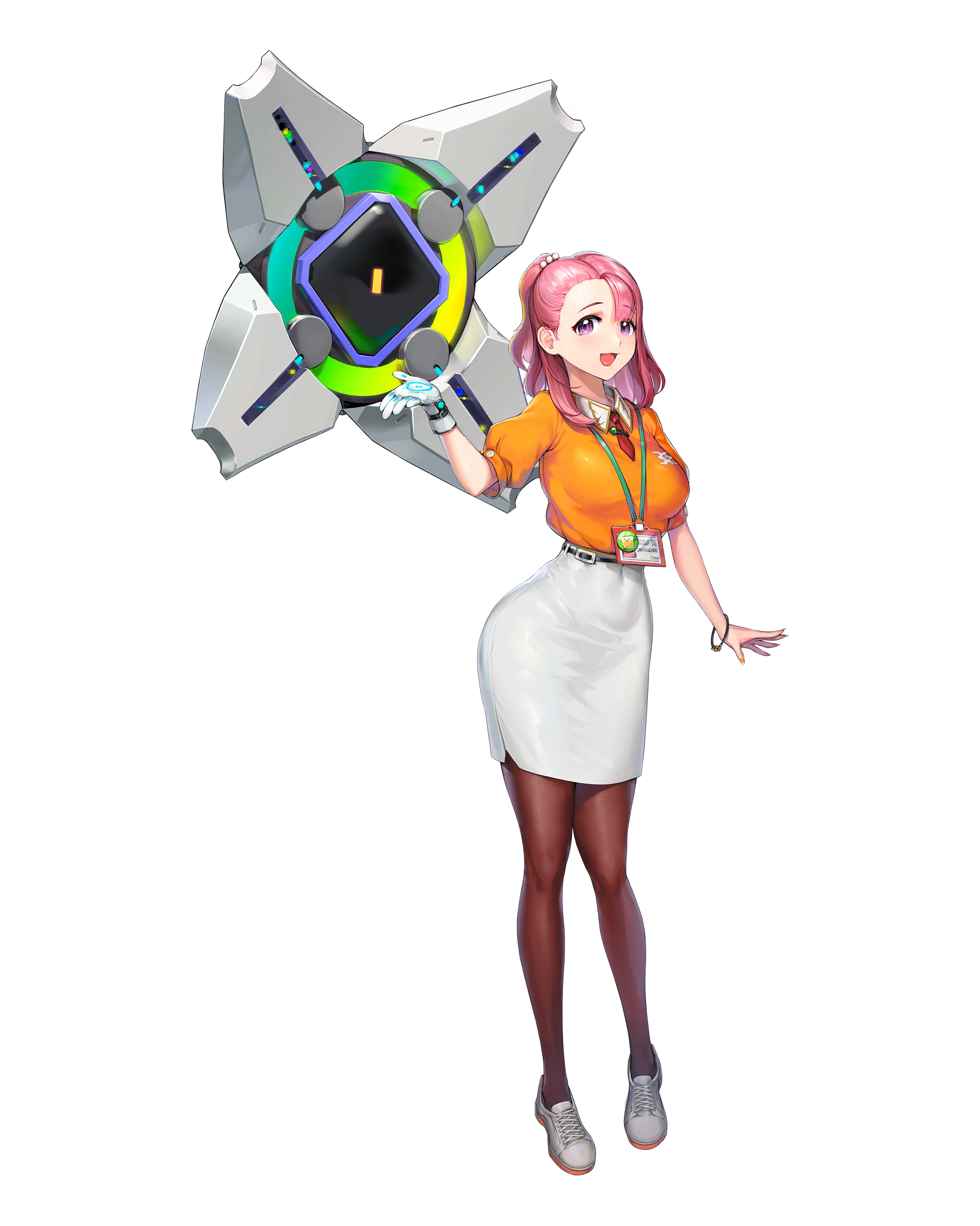 1girl :3 absurdres belt bracelet brown_pantyhose bumcha gloves gm_orangeade highres jewelry lanyard last_origin looking_at_viewer nail_polish one_side_up open_mouth orange_nails orangeade_(last_origin) pantyhose pencil_skirt pink_eyes pink_hair shoes single_glove skirt smile sneakers solo transparent_background white_gloves white_skirt