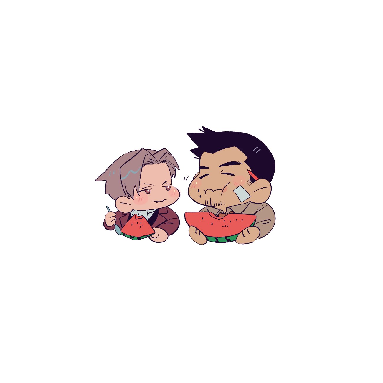 2boys ace_attorney ascot bandaid bandaid_on_cheek bandaid_on_face blush cheek_bulge chibi commentary_request cropped_torso dark-skinned_male dark_skin dick_gumshoe eating facial_hair formal_clothes goatee green_(grimy) highres light_brown_hair looking_at_another male_focus miles_edgeworth multiple_boys parted_bangs red_suit short_hair sideburns suit white_background