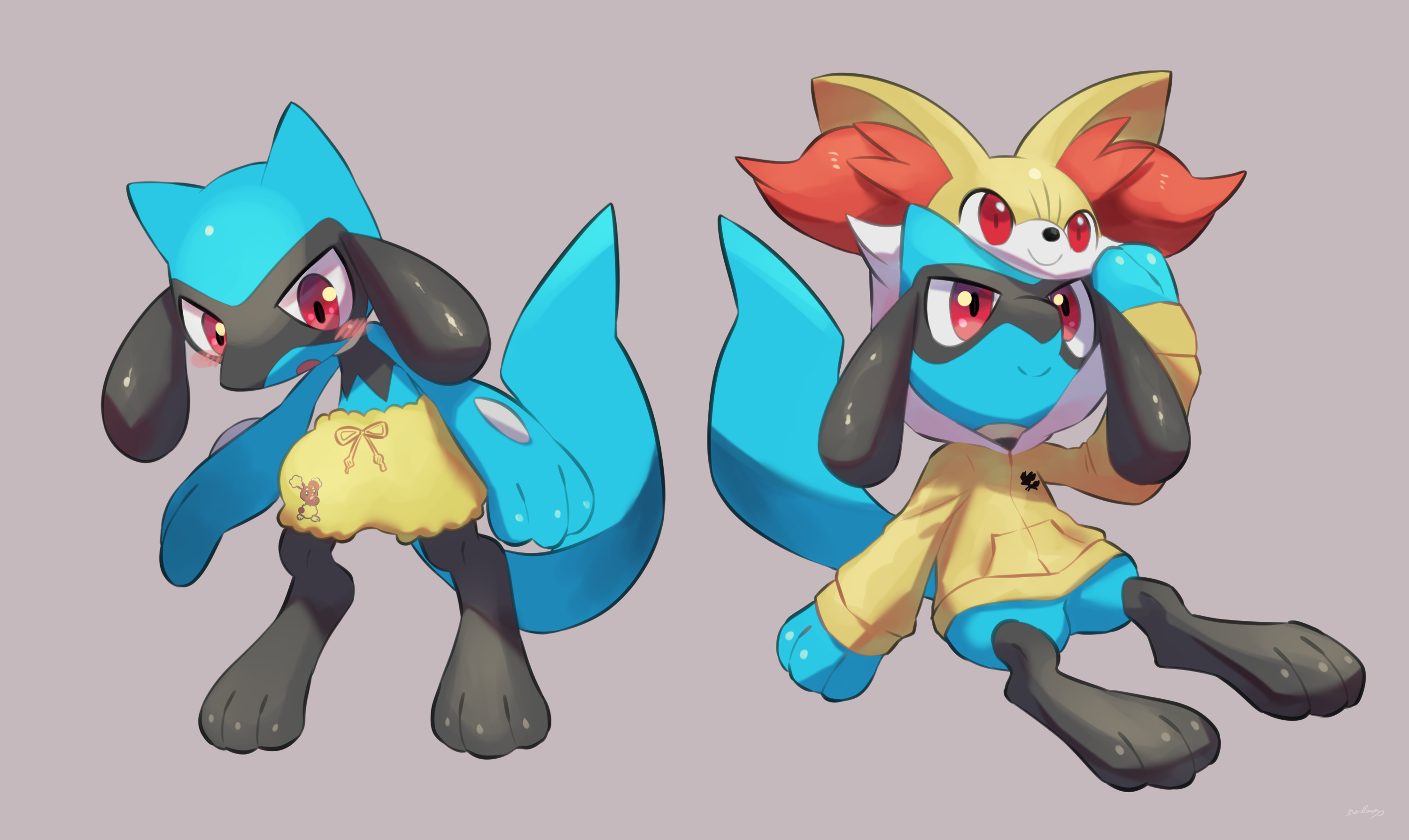 blush buneary buneary_(cosplay) character_print closed_mouth commentary cosplay fennekin fennekin_(cosplay) gen_4_pokemon gen_6_pokemon grey_background highres hood hood_up hoodie looking_down looking_up nintendo no_humans nullma pokemon pokemon_(creature) red_eyes riolu simple_background smile toes yellow_hoodie