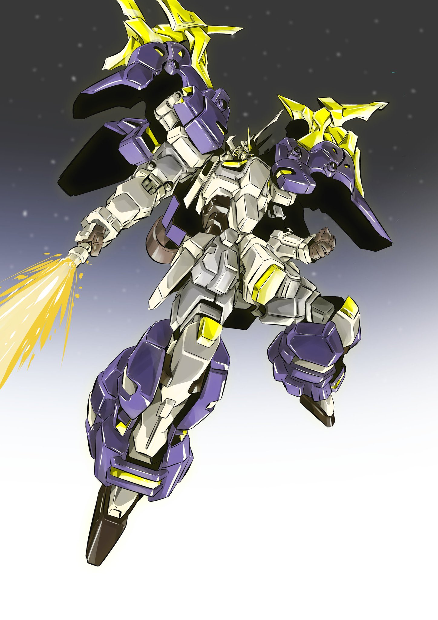 energy_sword energy_sword gradient_background gundam gundam_aesculapius gundam_wing gundam_wing_dual_story:_g-unit highres holding holding_sword holding_weapon looking_down mecha mobile_suit niidan no_humans open_hand robot science_fiction solo sword v-fin weapon yellow_eyes