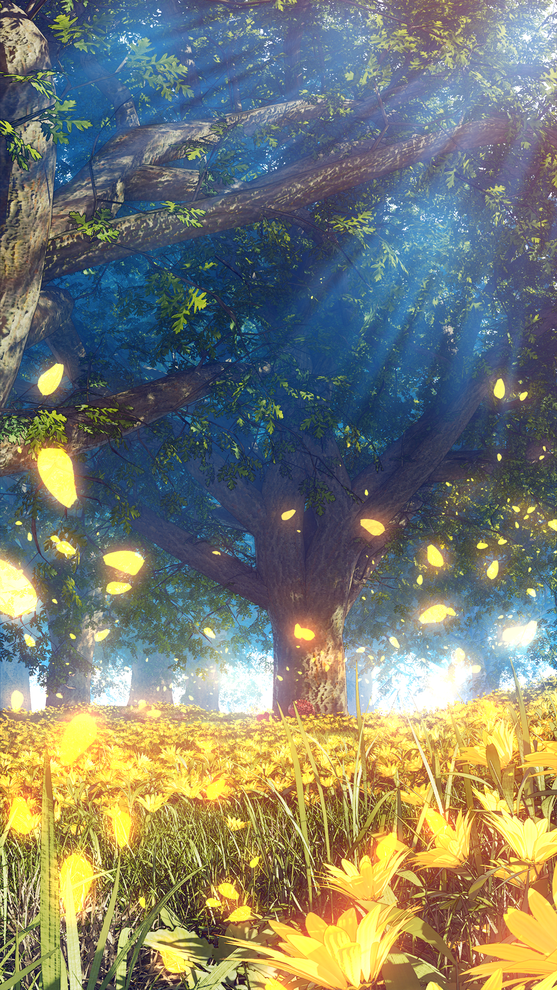 branch commentary_request day field flower flower_field forest grass hachio81 highres landscape leaf light_rays nature no_humans original outdoors petals scenery sunbeam sunlight tree tree_trunk