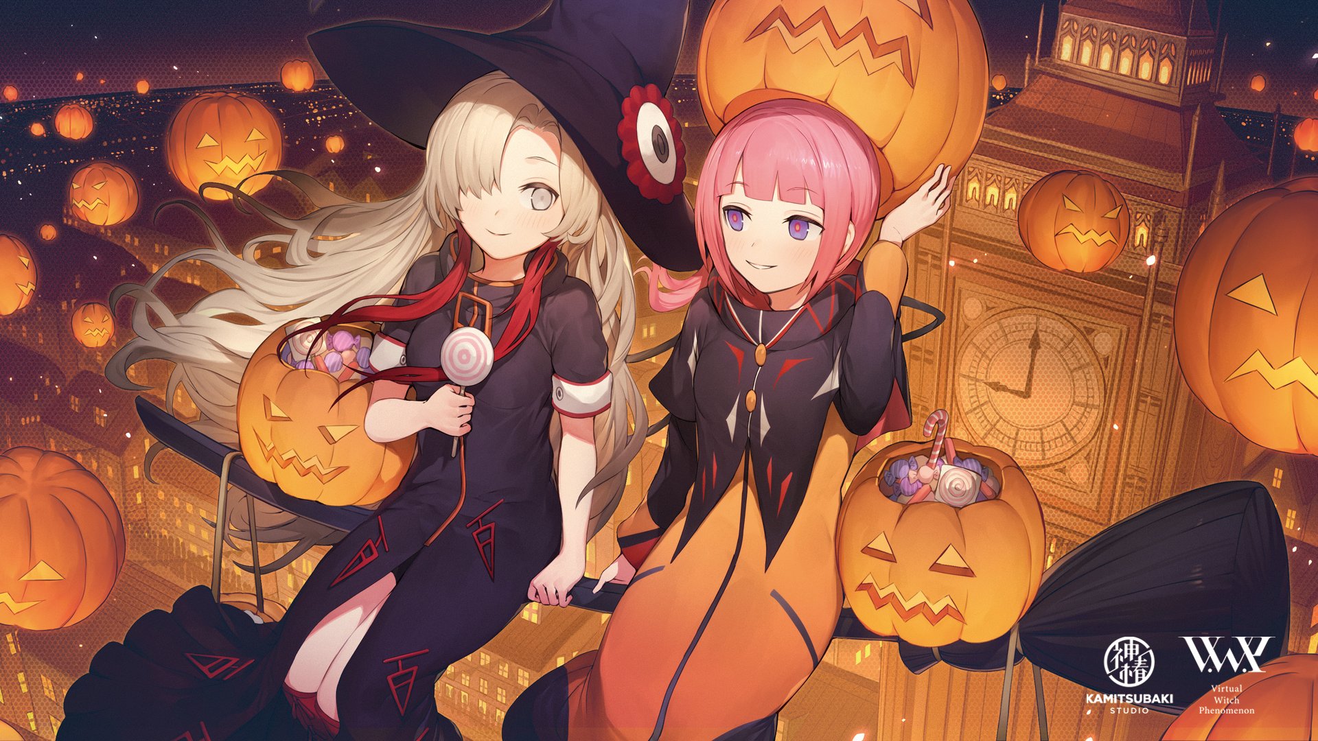 2girls black_dress broom broom_riding building candy cityscape clock clock_tower dress flying food grey_hair hair_over_one_eye halloween hat highres isekaijoucho jack-o'-lantern kaf_(kamitsubaki_studio) kamitsubaki_studio lollipop long_hair looking_at_another medium_hair multicolored_eyes multicolored_hair multiple_girls multiple_riders night official_art orange_dress parted_lips pink_hair pumpkin red_hair short_sleeves sidesaddle sky smile swirl_lollipop takeno_(hashi_falcon) tower two-tone_dress two-tone_hair virtual_youtuber witch witch_hat yellow_pupils