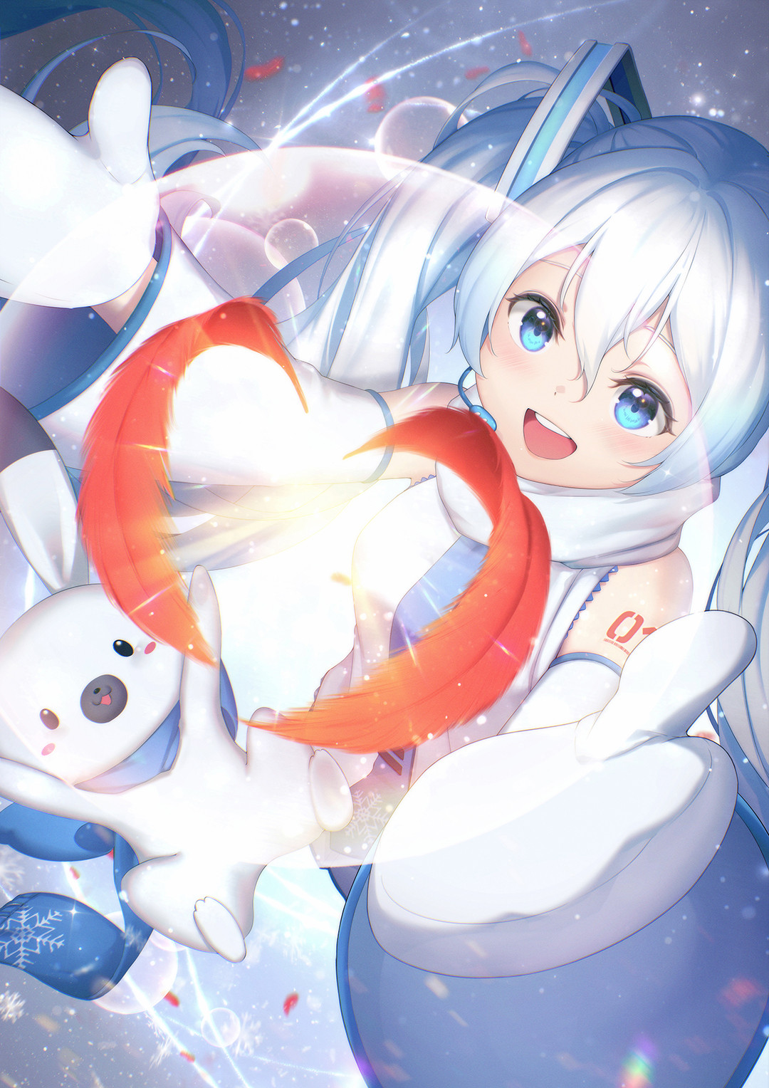 1girl 1other :d arm_tattoo arms_up bare_shoulders blue_eyes blue_neckwear blue_scarf commentary detached_sleeves english_commentary feathers foreshortening glowing hatsune_miku highres lolittleboy long_hair making-of_available mittens open_mouth outstretched_arms rabbit rabbit_yukine red_feathers scarf shoulder_tattoo smile tattoo twintails very_long_hair vocaloid white_hair white_mittens white_scarf yuki_miku yuki_miku_(2011)
