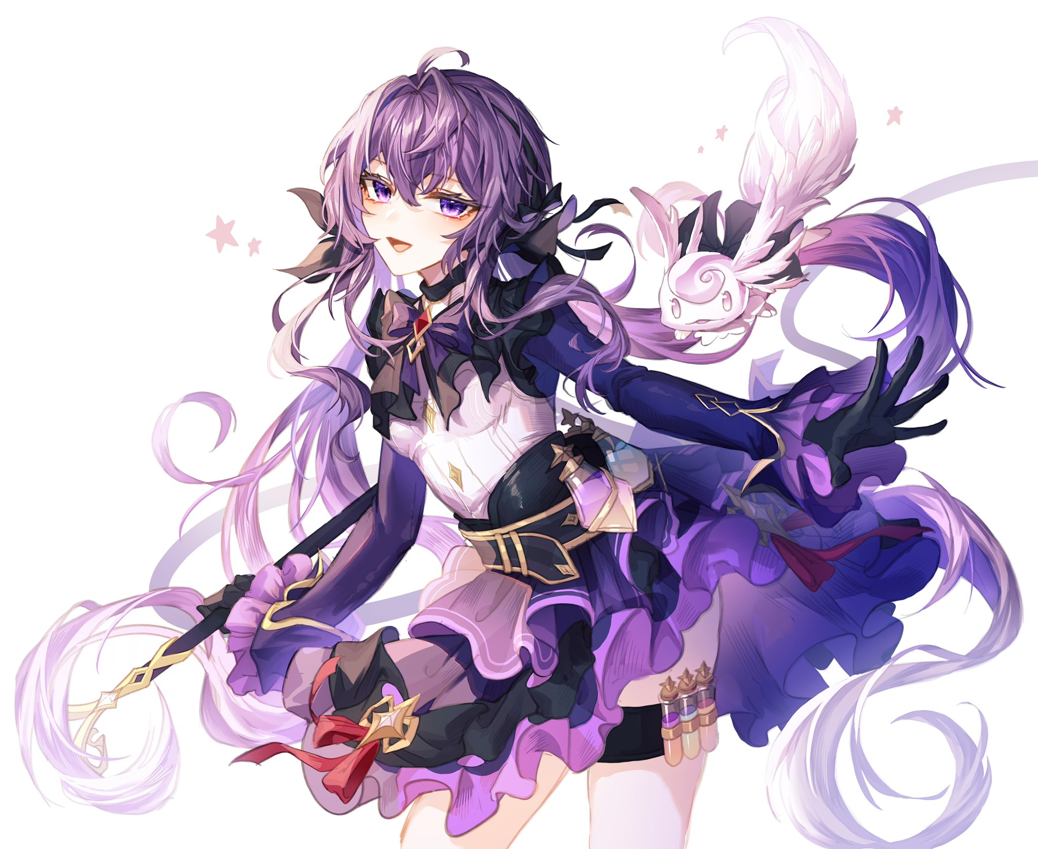 1girl ahoge aisha_landar belt black_bow black_gloves black_ribbon bow cowboy_shot dress elsword frilled_sleeves frills gloves hair_between_eyes hair_ribbon highres holding holding_staff homunculus leaning_to_the_side long_hair long_sleeves looking_at_viewer low_twintails mystic_alchemist_(elsword) open_mouth outstretched_arm outstretched_hand potion purple_bow purple_eyes purple_hair red_ribbon ribbon solo staff star_(symbol) takano_jiyuu test_tube thigh_strap twintails very_long_hair vial
