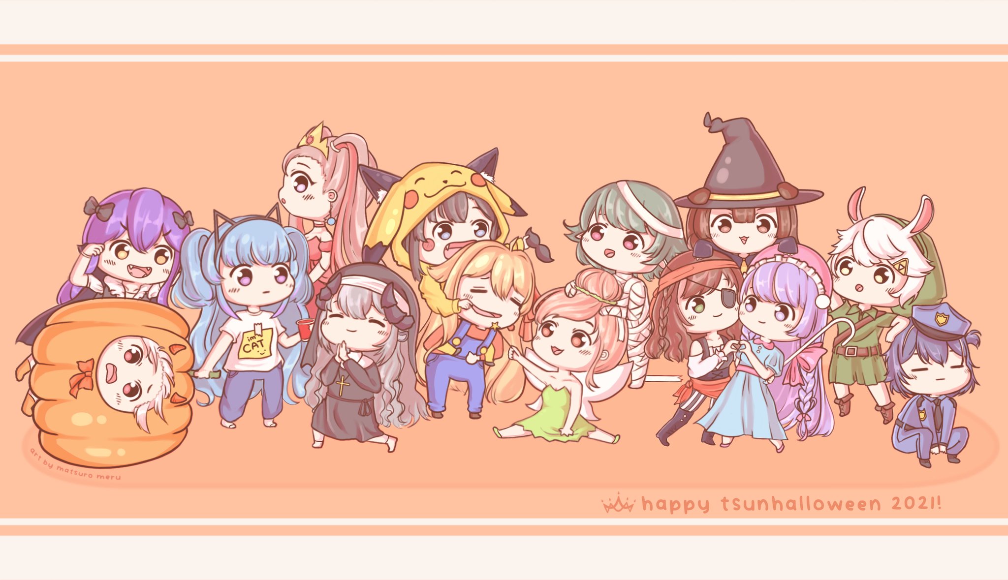 1other 2boys 6+girls :o =_= ^_^ amemachi_hanabi amiya_aranha animal_ears artist_name black_bow black_dress black_footwear black_hair black_headwear blonde_hair blue_dress blue_hair blue_headwear blue_jacket boots bow braid chibi chikafuji_lisa chromashift closed_eyes cosplay crown cup dog_ears dog_girl dress everyone eyepatch fake_facial_hair fake_mustache fangs gen_1_pokemon green_dress green_eyes green_hair grey_hair hair_behind_ear hair_bow halloween hands_on_another's_head hat highres holding holding_cup horns hoshino_char inukai_purin jacket link link_(cosplay) lying mario mario_(cosplay) mario_(series) matsuro_meru matsuro_meru_(artist) miori_celesta multicolored_hair multiple_boys multiple_girls mummy nini_yuuna nintendo nun on_side one_eye_covered open_mouth orla_gan_ceann pikachu pikachu_(cosplay) pikachu_costume pink_dress pink_hair pirate_costume pokemon police_hat pumpkin_costume purple_hair rabbit_boy rabbit_ears sheep_ears sheep_girl sheep_horns shirt short_side_ponytail side_ponytail streaked_hair surprised tetsuya_kazune the_legend_of_zelda tinker_bell_(disney) tinker_bell_(disney)_(cosplay) tsunderia tsurugi_nen twintails two_side_up umiushi_urara uzuki_tomoya virtual_youtuber walt_disney's_peter_pan white_shirt witch witch_hat yazaki_kallin