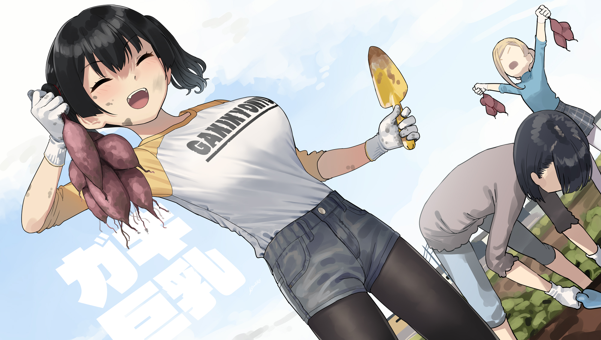 3girls :d ^_^ black_hair black_pantyhose blonde_hair blue_sky breasts closed_eyes clothes_writing cloud copyright_name day dutch_angle food gaki_kyonyuu gloves grey_shorts harvest highres holding holding_trowel japanese_text kaedeko_(kaedelic) lady_flat_chest_(gaki_kyonyuu) large_breasts multiple_girls open_mouth original outdoors pantyhose pantyhose_under_shorts plaid_clothes plaid_skirt raglan_sleeves sasaki_kanna sasaki_miyuki shirt shirt_tucked_in short_hair short_shorts shorts skirt sky smile sweet_potato teeth trowel twintails upper_teeth_only white_gloves