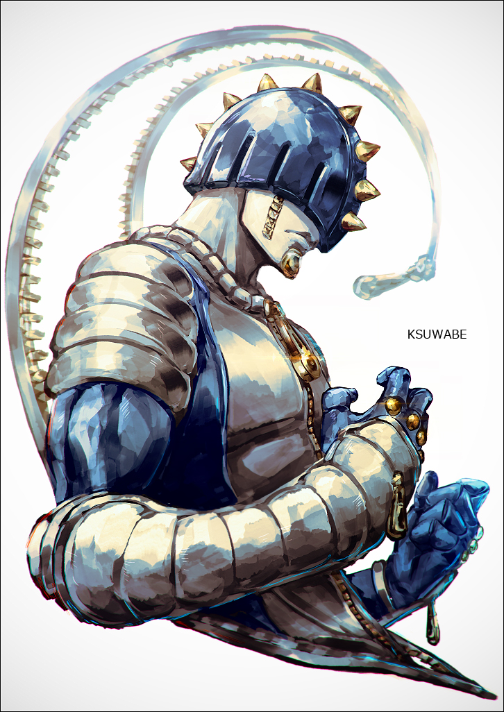 1other artist_name blue_skin closed_mouth colored_skin jojo_no_kimyou_na_bouken k-suwabe no_eyes no_humans simple_background spikes stand_(jojo) sticky_fingers_(stand) vento_aureo white_background zipper