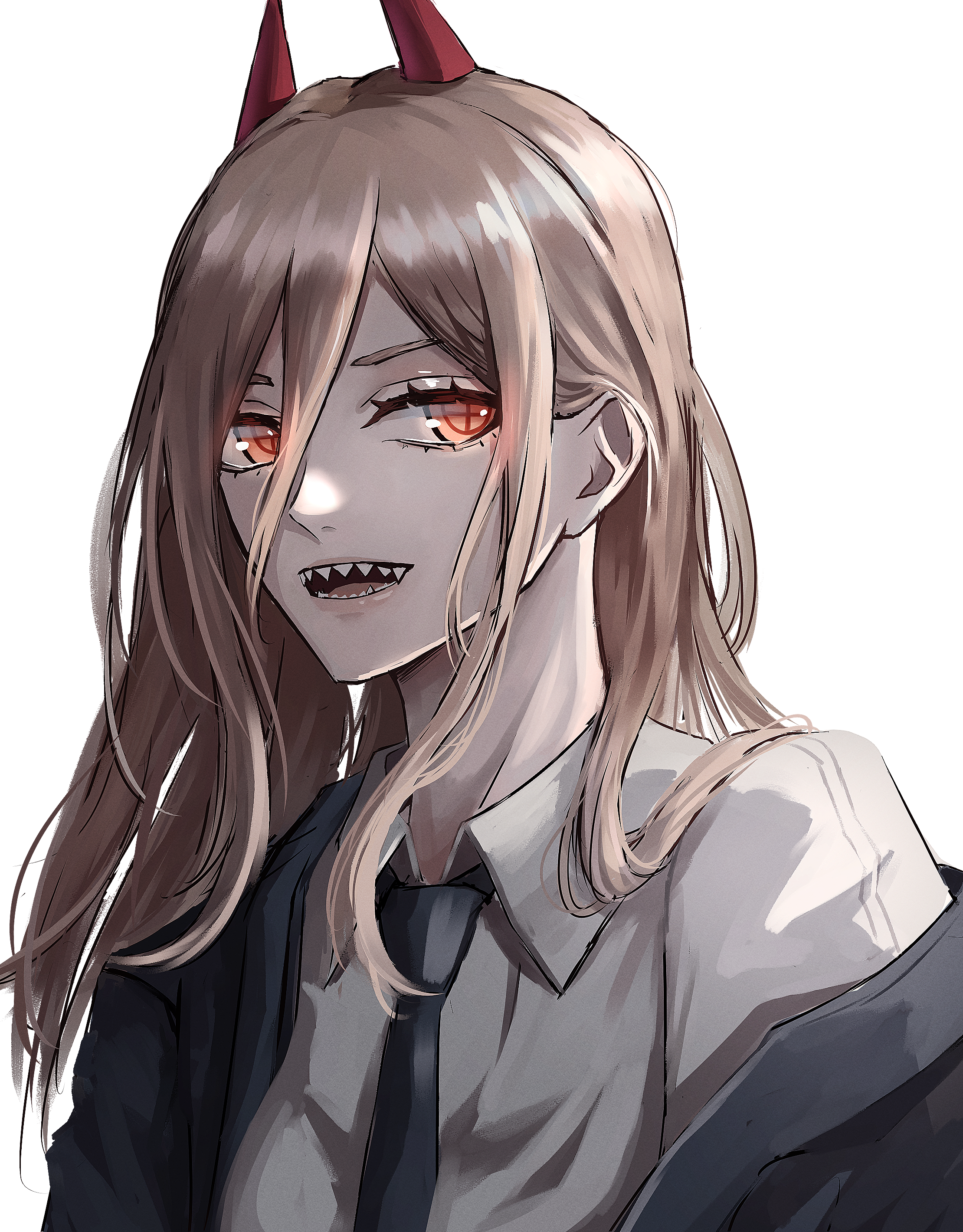 +_+ 1girl absurdres bad_id bad_pixiv_id blonde_hair chainsaw_man collared_shirt cross-shaped_pupils demon_girl demon_horns hair_between_eyes highres horns jacket kyonamu long_hair necktie open_mouth power_(chainsaw_man) red_eyes red_horns sharp_teeth shirt simple_background smile solo symbol-shaped_pupils teeth white_background white_shirt