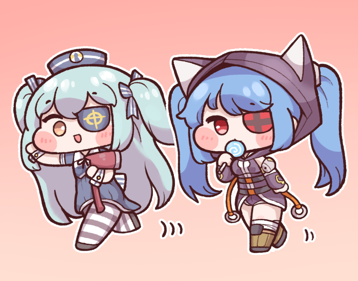 2girls animal_hood axe blue_hair blush bulga candy cat_hood chibi dress eyepatch fire_axe food full_body hair_ribbon hat holding holding_candy holding_food holding_lollipop hood last_origin light_blue_hair lollipop long_hair looking_at_viewer lrl_(last_origin) multiple_girls open_mouth pantyhose red_eyes ribbon sailor_dress sailor_hat smile striped_clothes striped_legwear striped_pantyhose swirl_lollipop tachi_(artificial_hero) trait_connection two_side_up yellow_eyes