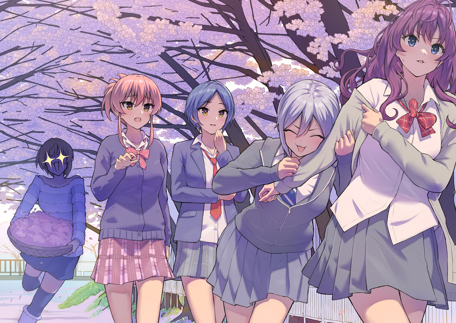 +_+ :3 :d :o basket blouse bow bowtie cherry_blossoms collared_shirt colonnade cowboy_shot hair_between_eyes hayami_kanade holding holding_another's_arm holding_basket ichinose_shiki idolmaster idolmaster_cinderella_girls jougasaki_mika lipps_(idolmaster) looking_at_another loose_bowtie loose_necktie miyamoto_frederica morimiya_masayuki necktie off-shoulder_shirt off_shoulder open_collar open_mouth parted_bangs plaid_clothes plaid_skirt pleated_skirt running school_uniform shiomi_syuko shirt skirt smile striped_bow striped_bowtie striped_clothes striped_necktie striped_shirt thighhighs tree walking