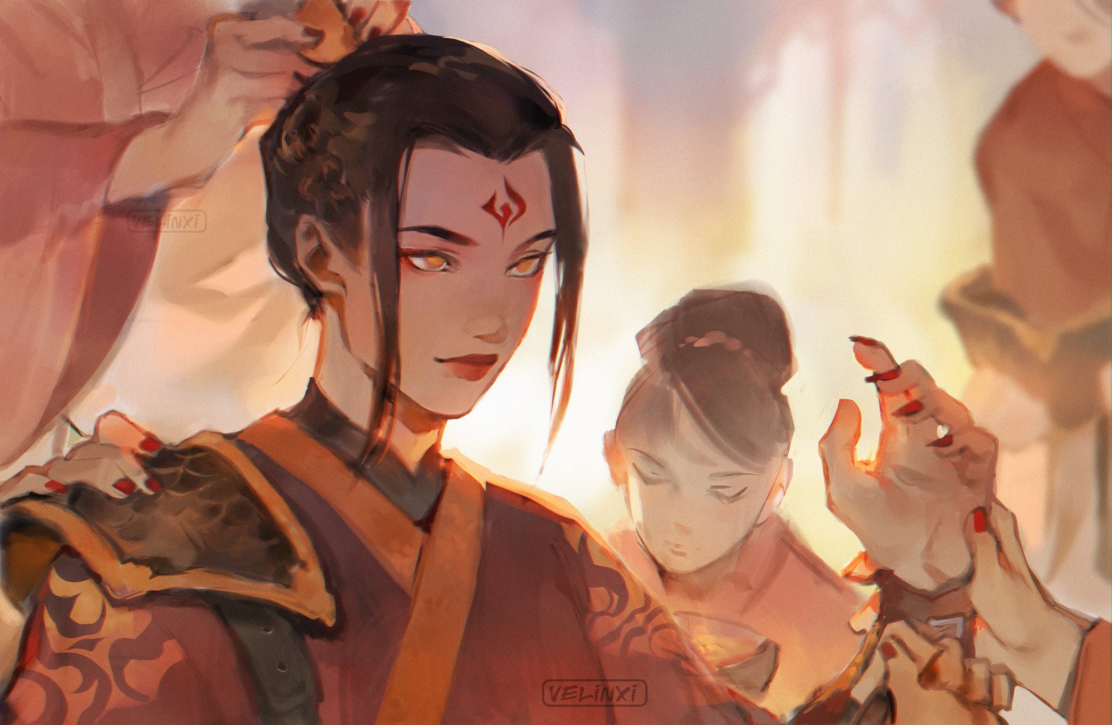 1girl avatar:_the_last_airbender avatar_legends azula black_hair eyelashes eyeliner eyeshadow facepaint facial_mark fingernails forehead_mark highres lips lipstick makeup nail_polish orange_eyes pale_skin red_eyeliner red_eyeshadow red_nails sharp_fingernails smile velinxi