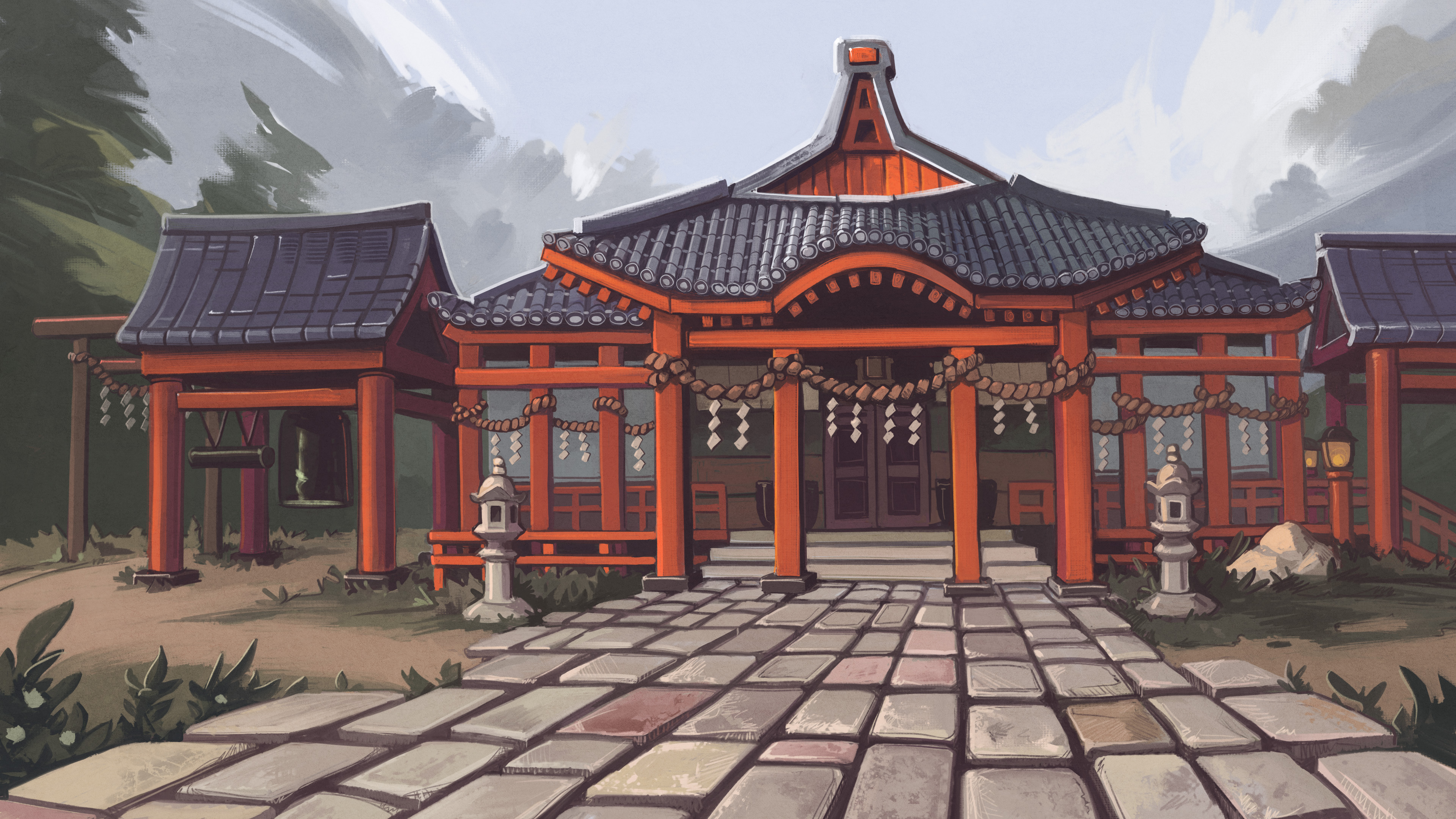 absurdres architecture bell building day door east_asian_architecture gensokyo grass highres lantern myouren_temple no_humans outdoors path pavement pillar porch railing road rock rope scenery shide shimenawa shinto shrine shrine_bell sky stairs stone_lantern stone_walkway torii touhou traditional_media u-joe wooden_lantern