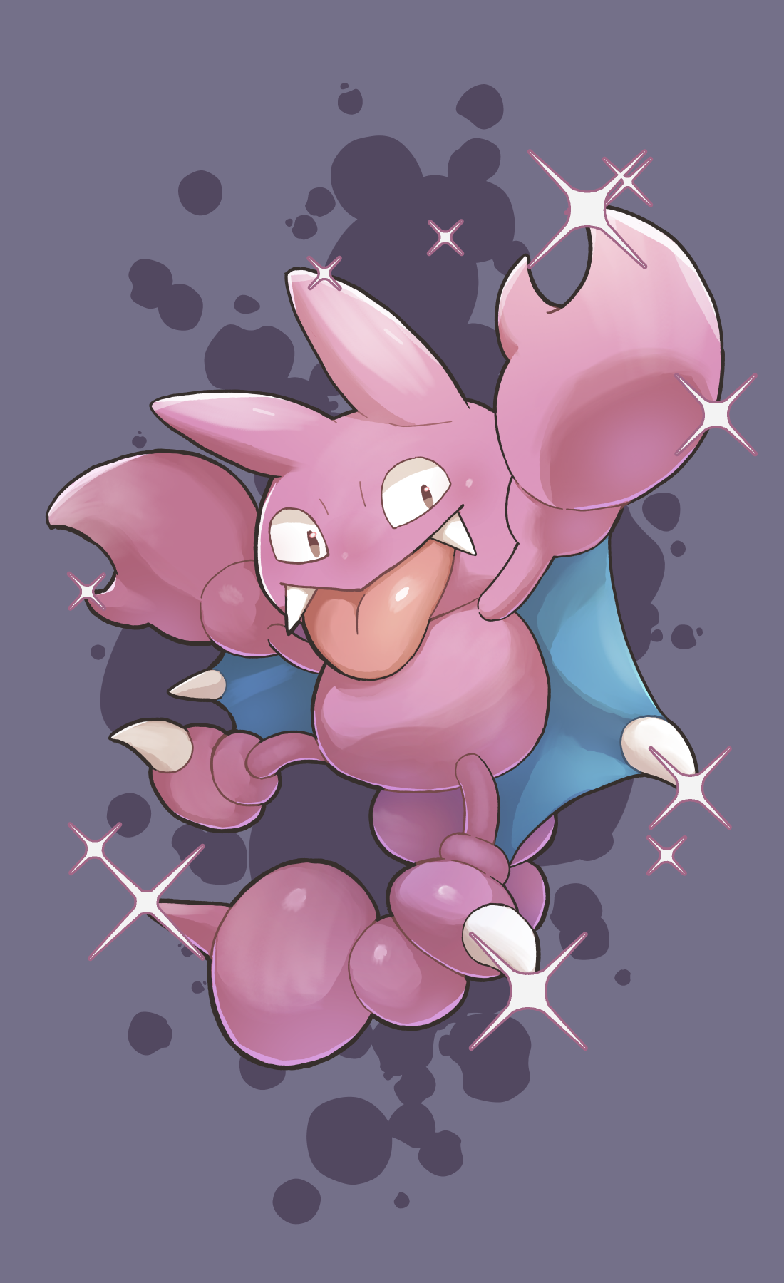 brown_eyes claws commentary_request fangs full_body gen_2_pokemon gligar grey_background highres looking_down nintendo no_humans pokemon pokemon_(creature) pokemon_focus solo sparkle tongue tongue_out yunosuke