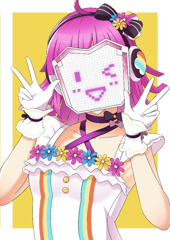 1girl ;) artist_name artist_request bare_shoulders black_bow black_choker blunt_bangs blush bow breasts choker cleavage collarbone criss-cross_halter dress female_focus flat_chest flower flower_dress frilled_dress frilled_shirt_collar frills gloves hair_bow hair_flower hair_ornament halterneck head-mounted_display headphones looking_at_viewer love_live! love_live!_nijigasaki_high_school_idol_club love_live!_school_idol_festival love_u_my_friends mask one_eye_closed parted_lips pink_hair plaid_clothes plaid_dress pleated pleated_dress ribbon screen short_hair sleeveless sleeveless_dress small_breasts smile solo star_(symbol) star_print tennoji_rina upper_body white_dress white_gloves white_wrist_cuffs wink wrist_cuffs yellow_background you_and_i_(love_live!)