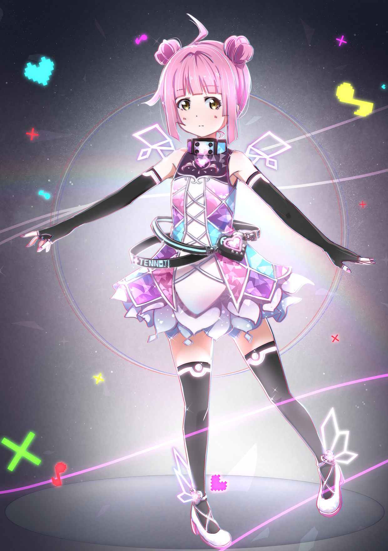 1girl alternate_hairstyle analog_heart_(love_live!) artist_name artist_request bag bare_shoulders belt belt_pouch black_gloves black_legwear blush breasts brown_eyes cross-laced_clothes cross-laced_dress double_bun double_horizontal_stripe dress dress_shirt elbow_gloves fake_wings female_focus fingerless_gloves flat_chest floral_print full_body gloves hair_bun handbag heart_(symbol) high_collar high_heels highres looking_at_viewer love_live! love_live!_nijigasaki_high_school_idol_club love_live!_school_idol_festival love_live!_school_idol_festival_all_stars miniskirt multicolored_dress musical_note nail_(hardware) nail_polish outstretched_arms parted_lips pink_hair pink_nails plaid_clothes plaid_skirt pleated pleated_skirt pouch shirt short_hair skirt sleeveless sleeveless_dress small_breasts smile solo sparkle spread_arms standing tennoji_rina white_footwear white_skirt wings x_(symbol) yellow_eyes