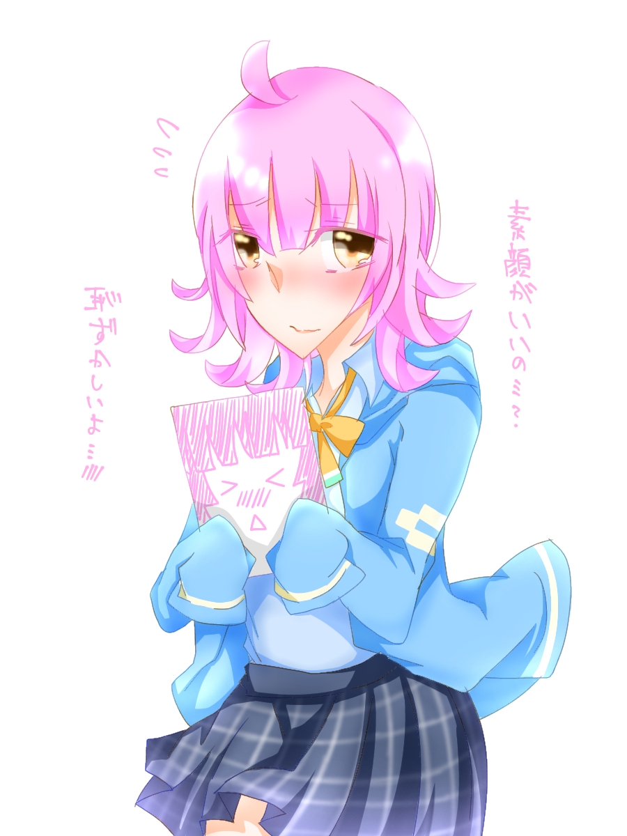 1girl aqua_jacket aqua_shirt artist_name artist_request black_skirt blue_jacket blue_skirt blunt_bangs blush bow bowtie breasts brown_eyes check_translation checkered_clothes checkered_skirt collared_shirt commentary_request drawing drawstring embarrassed female_focus flat_chest highres holding holding_notebook hood hooded_jacket jacket long_sleeves looking_at_viewer love_live! love_live!_nijigasaki_high_school_idol_club miniskirt neck_ribbon nijigasaki_school_uniform notebook open_clothes open_jacket paper parted_lips pink_hair plaid_clothes plaid_skirt pleated pleated_skirt ribbon school_uniform shirt short_hair sketchbook skirt sleeves_past_wrists small_breasts smile solo summer_uniform sweatdrop tennoji_rina translated translation_request white_shirt yellow_bow yellow_eyes yellow_ribbon