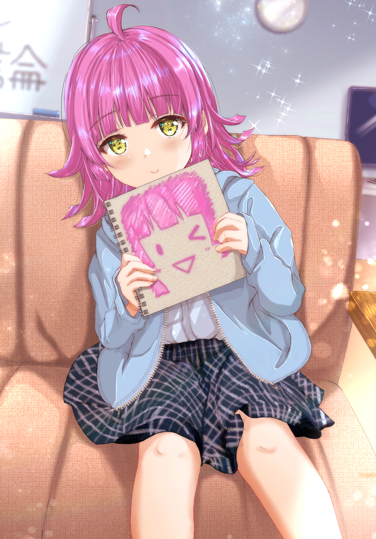 1girl aqua_jacket aqua_shirt artist_name artist_request bad_id bad_pixiv_id bare_legs black_skirt blue_jacket blue_skirt blunt_bangs blush bow bowtie breasts brown_eyes chair chalkboard chalkboard_writing checkered_clothes checkered_skirt clock collared_shirt drawing drawstring female_focus flat_chest highres holding holding_notebook hood hooded_jacket indoors jacket long_sleeves looking_at_viewer love_live! love_live!_nijigasaki_high_school_idol_club miniskirt neck_ribbon nijigasaki_school_uniform notebook on_chair open_clothes open_jacket paper parted_lips pink_hair plaid_clothes plaid_skirt pleated pleated_skirt ribbon school_uniform shirt short_hair sitting sketchbook skirt sleeves_past_wrists small_breasts smile solo sparkle summer_uniform television tennoji_rina white_shirt yellow_bow yellow_eyes yellow_ribbon