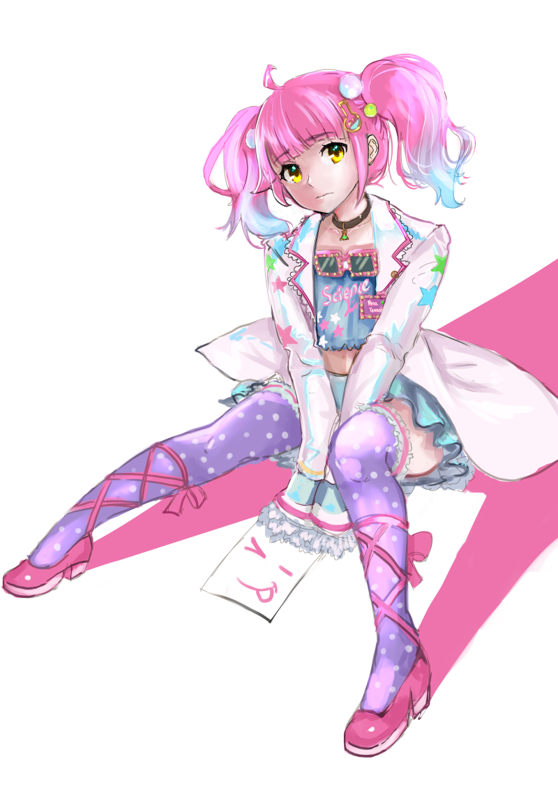 1girl alternate_hairstyle ankle_lace-up aqua_shirt aqua_skirt artist_name artist_request black_choker blush breasts brown_eyes cardigan choker clothes_writing collarbone drawing female_focus flat_chest frilled_legwear frilled_sleeves frills full_body glasses hair_bobbles hair_ornament hairclip high_heels jacket lab_coat long_sleeves looking_at_viewer love_live! love_live!_nijigasaki_high_school_idol_club love_live!_school_idol_festival love_live!_school_idol_festival_all_stars miniskirt paper parted_lips pink_hair pink_shoes plaid_clothes plaid_skirt pleated pleated_skirt polka_dot polka_dot_legwear purple_legwear shirt shoes short_hair sitting skirt sleeves_past_fingers sleeves_past_wrists small_breasts smile solo star_(symbol) star_print tennoji_rina twintails white_background white_cardigan white_jacket yellow_eyes