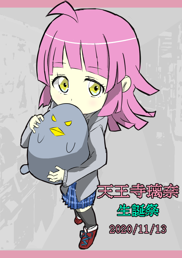 1girl artist_name artist_request black_legwear black_skirt blush breasts brown_eyes checkered_clothes checkered_skirt chibi cross-laced_footwear female_focus full_body grey_background grey_jacket holding holding_stuffed_toy jacket long_sleeves looking_at_viewer love_live! love_live!_nijigasaki_high_school_idol_club miniskirt parted_lips pink_hair plaid_clothes plaid_skirt pleated pleated_skirt red_shoes shoes short_hair skirt smile solo standing stuffed_animal stuffed_toy tennoji_rina yellow_eyes