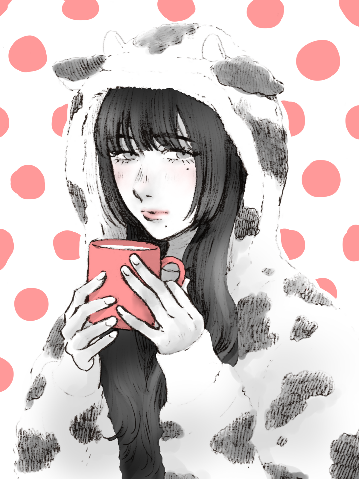 1boy animal_hood animal_print arisa_(yuki_touko) black_hair blunt_bangs blush cow_horns cow_print cup grey_eyes highres holding holding_cup hood hoodie horns lips long_hair male_focus mole mole_under_eye mole_under_mouth mug original polka_dot polka_dot_background solo yuki_touko