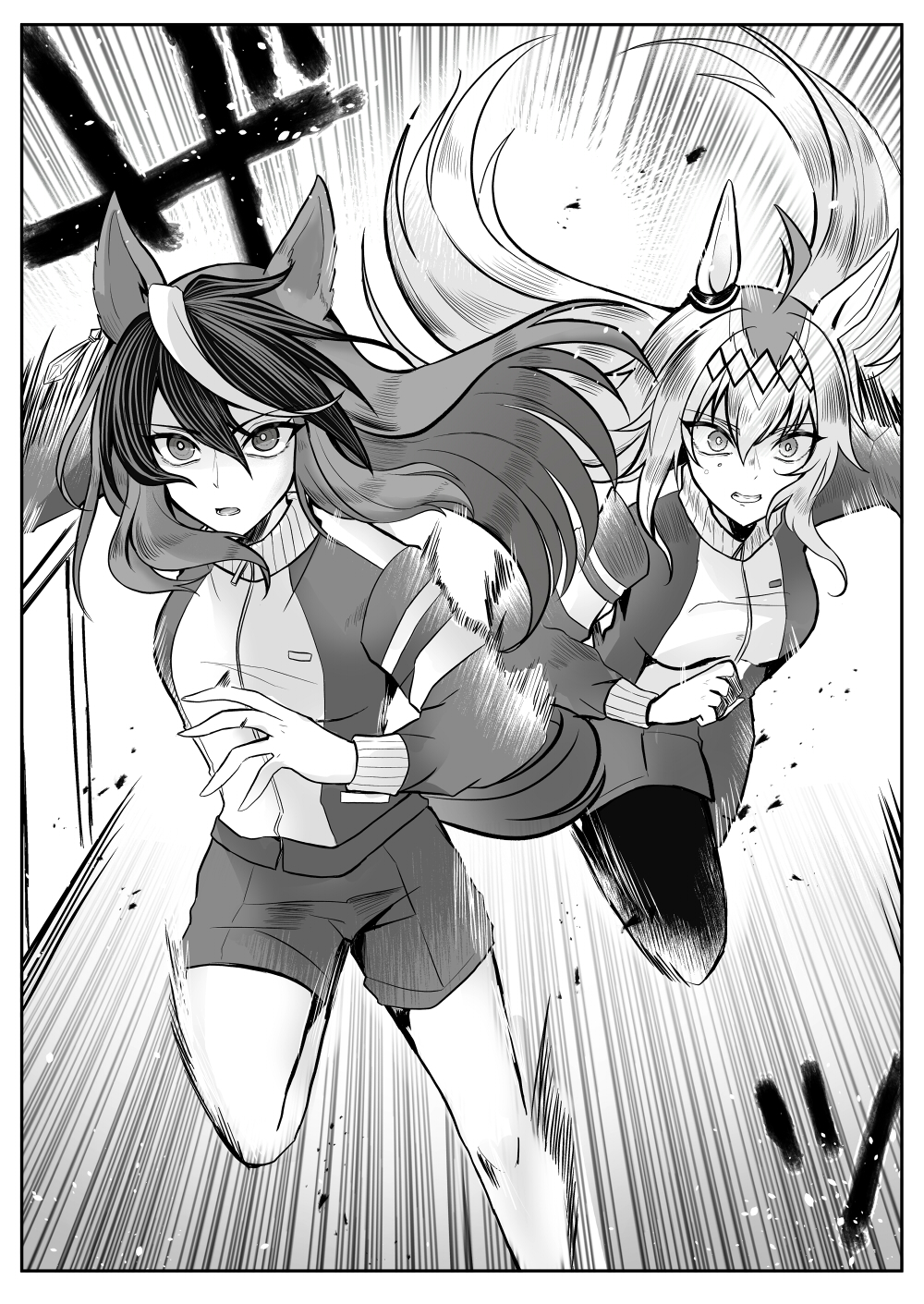 2girls animal_ears clenched_teeth feet_out_of_frame greyscale hair_between_eyes highres horse_ears horse_girl horse_tail jacket pantyhose_under_shorts long_hair mimoe monochrome multicolored_hair multiple_girls oguri_cap_(umamusume) open_mouth pantyhose running shorts streaked_hair symboli_rudolf_(umamusume) tail teeth track_jacket umamusume umamusume:_cinderella_gray