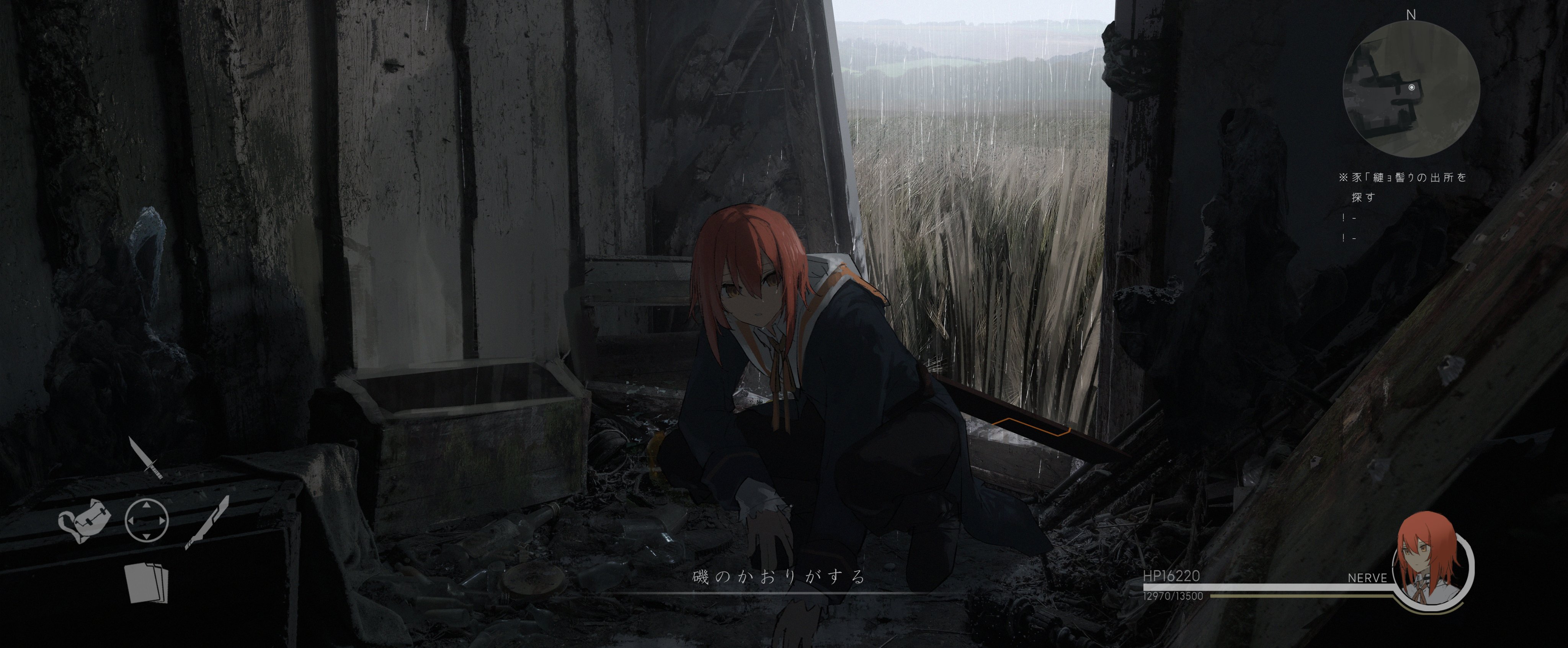 1girl absurdres asteroid_ill black_pants fake_screenshot heads-up_display health_bar highres long_hair long_sleeves minimap optic_nerve_(asteroid_ill) original pants red_hair solo squatting user_interface yellow_eyes