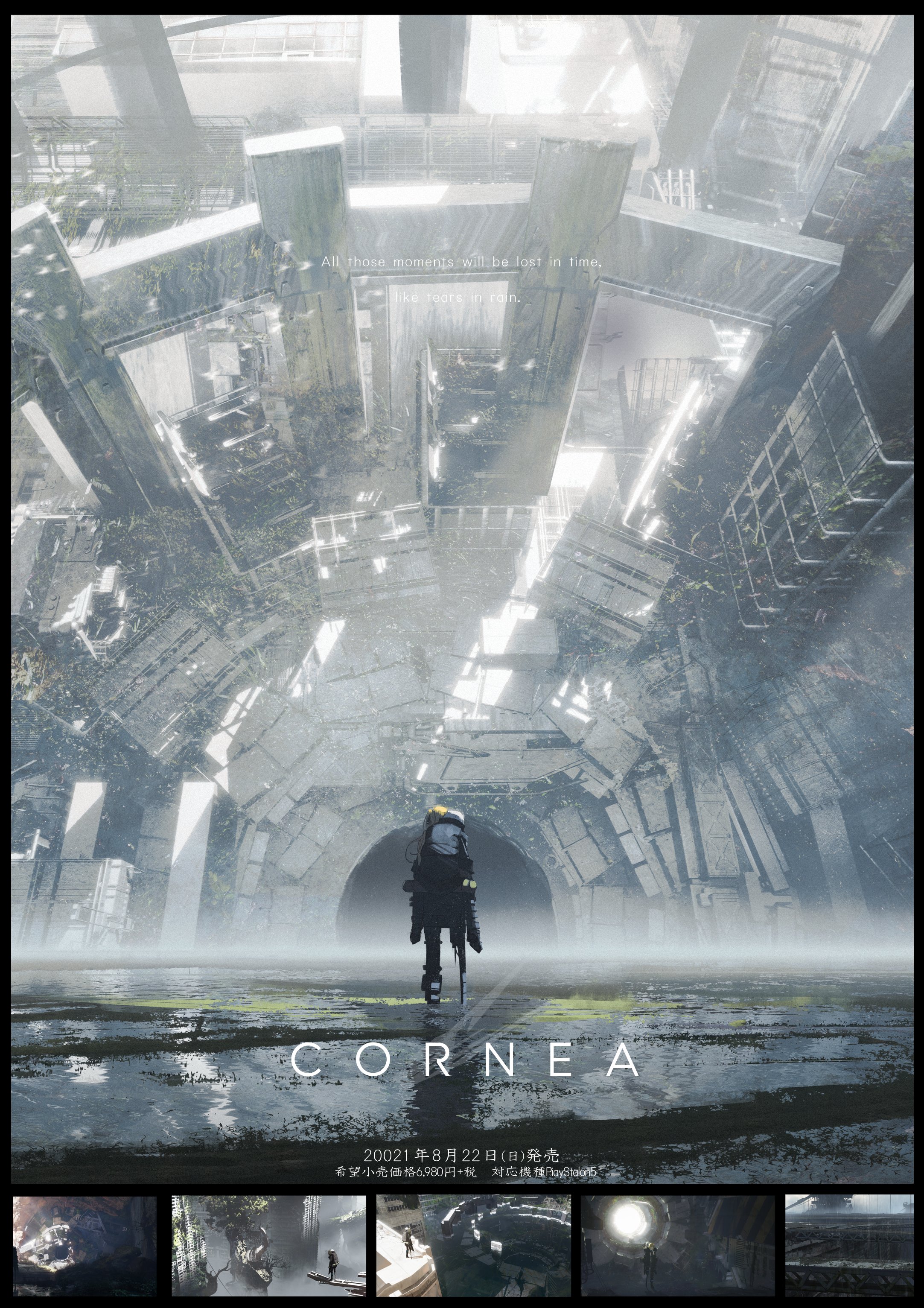 2girls absurdres asteroid_ill black_border blade_runner_(series) blade_runner_(1982_movie) blonde_hair border carrying character_name cornea_(asteroid_ill) from_behind highres iz_(asteroid_ill) multiple_girls original peg_leg piggyback post-apocalypse poster_(medium) puddle scenery standing sunlight translation_request typo white_hair