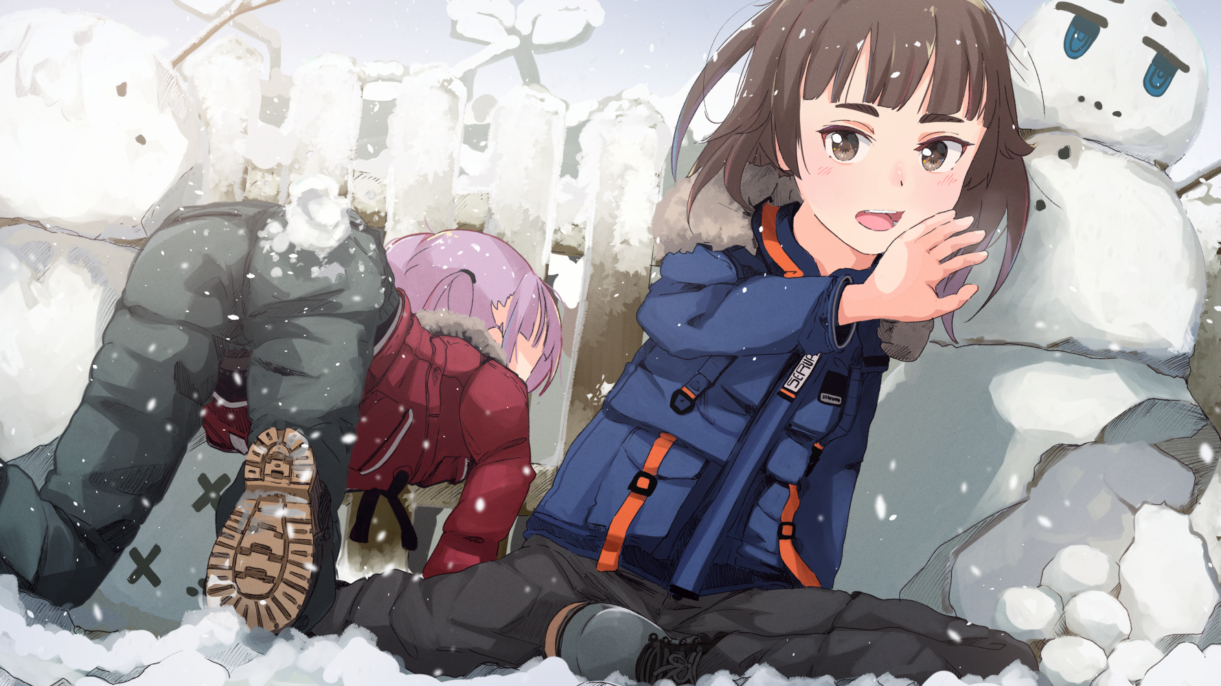2girls ass black_pants blue_coat blunt_bangs blush brown_eyes clip_studio_paint_(medium) coat commentary_request covering_face full_body fur-trimmed_hood fur_trim grey_footwear grey_pants highres hood hood_down hooded_coat kneeling long_sleeves looking_at_viewer multiple_girls open_mouth original pants pocket red_coat russian_commentary servachok shoe_soles shoes short_twintails sitting sneakers snow snowball snowman teeth twintails upper_teeth_only winter_uniform yokozuwari