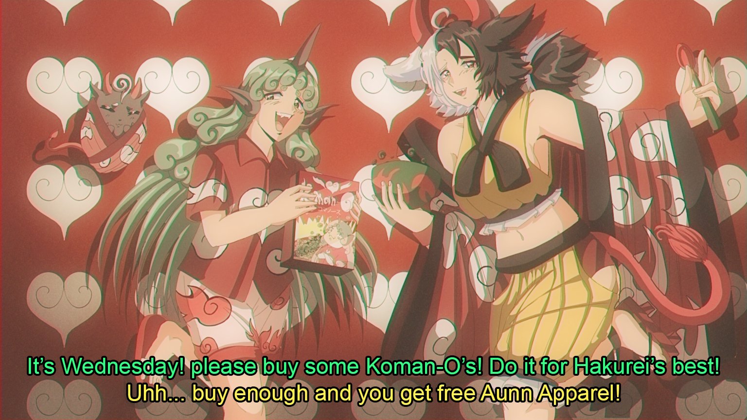 1990s_(style) 2girls ahoge animal_ears animal_print aqua_hair black_hair bowl cereal_box cloud_print collared_shirt cow_ears cow_girl cow_horns cow_print cow_tail crop_top curly_hair frilled_shorts frills green_eyes grey_hair heart horns kariyushi_shirt komainu komano_aunn long_hair midriff multicolored_hair multiple_girls navel open_mouth red_horns red_shirt red_tail retro_artstyle sandals shirt short_sleeves shorts single_horn split-color_hair statue step_arts stomach tail tank_top touhou two-tone_hair ushizaki_urumi very_long_hair white_shorts wide_sleeves yellow_shorts yellow_tank_top